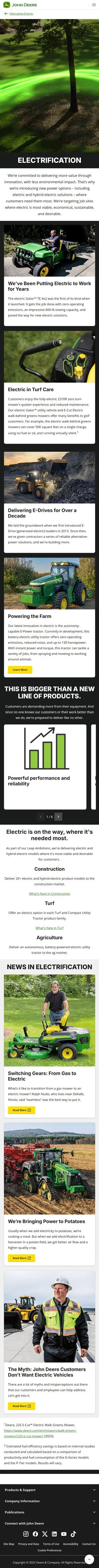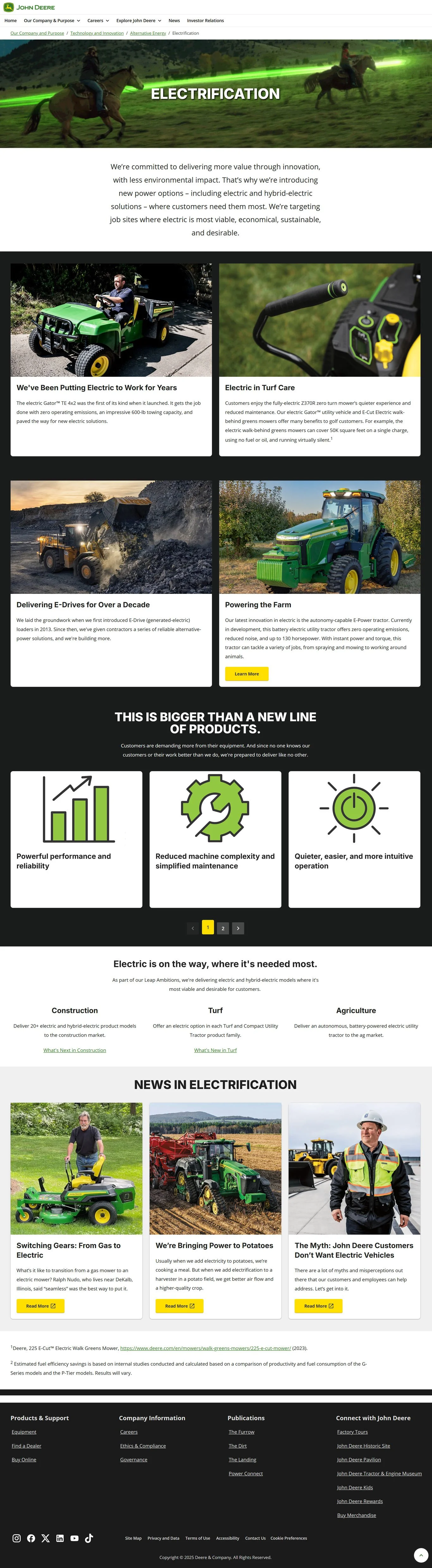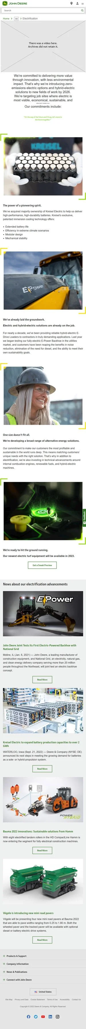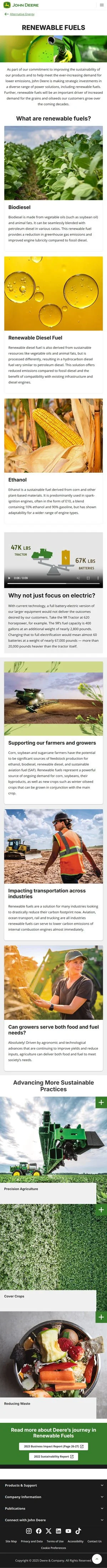 This project was a business-critical and urgent response to growing user interest and spreading misinformation about John Deere's electrifiation and alternative power equipment. With only a few weeks to introduce a new Renewable Energy landing page, redesign the existing Electrification page, and add an additional supplementary page for Renewable Fuels, there was no room for error.