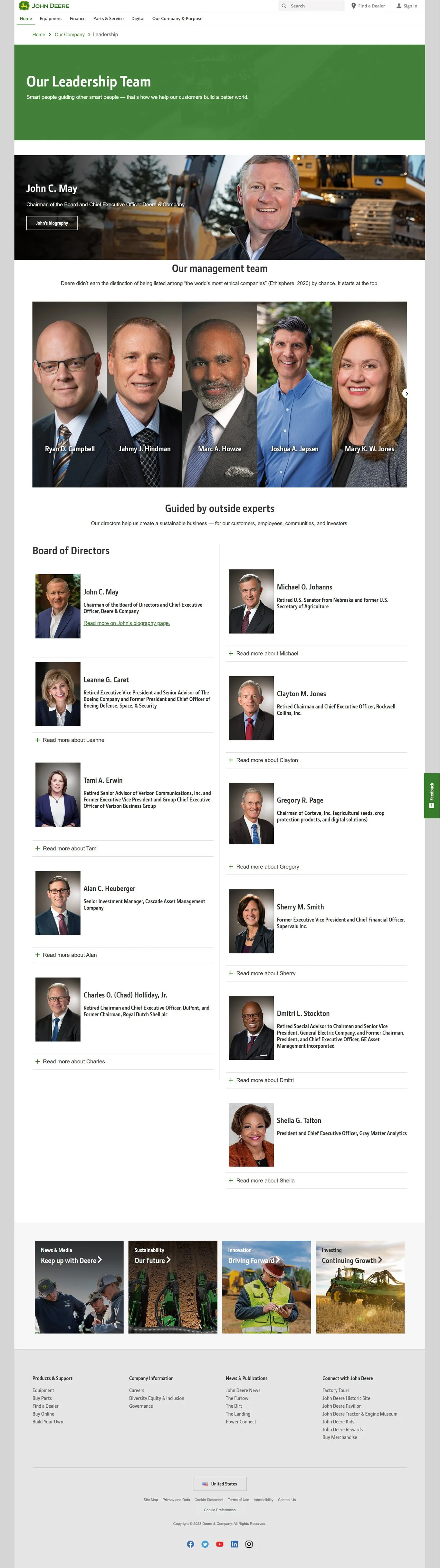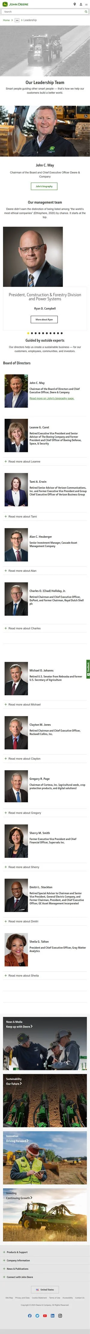 The Leadership redesign was a direct result of needing to convert outdated and non-brand compliant content into About.Deere.com, which I was wholly responsible for publishing and maintaining. The challenge was real: I was asked to design the webpage under scrutiny from top-level leadership (including the CEO, John May), brand management, and the entire John Deere user audience.